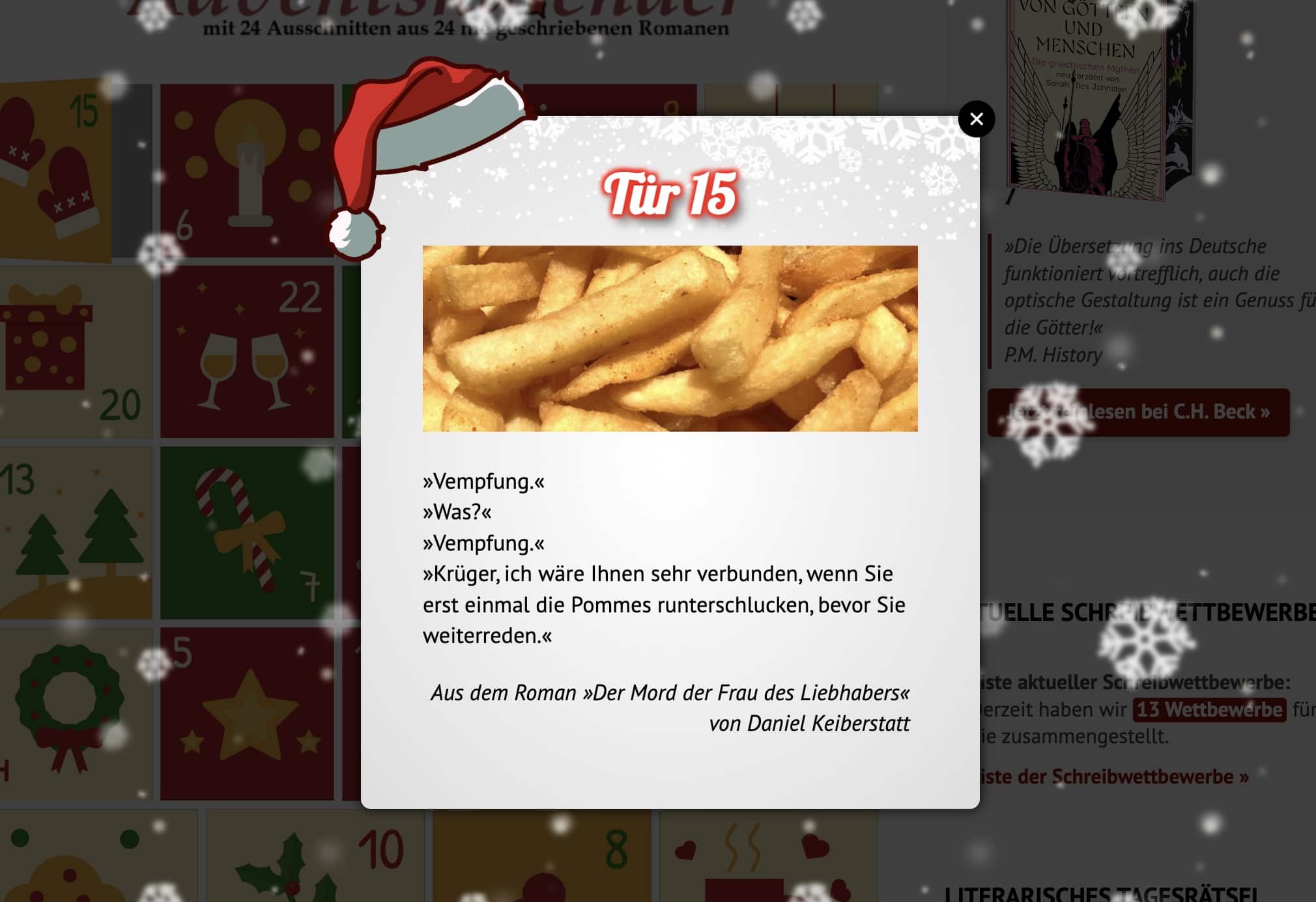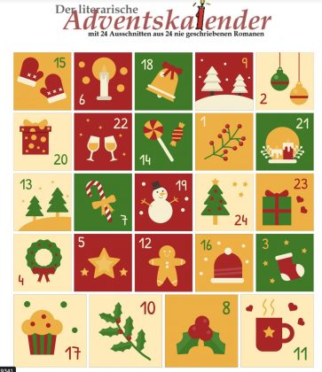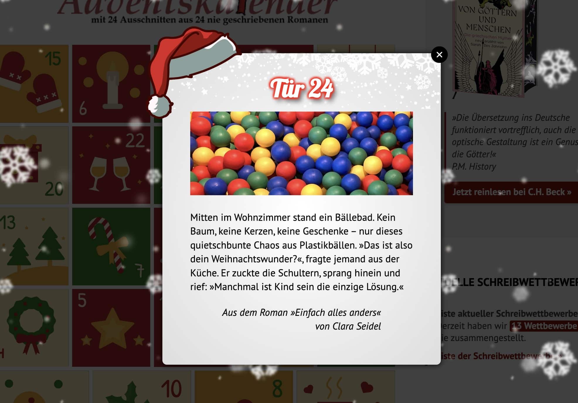 Der Adventskalender war zudem die kleine literarische Schreibaufgabe zum Jahresende für unser Team. Wenige Worte, vielleicht zwei oder drei Absätze sollten einen Roman, ein Genre oder eine Situation skizzieren. Der vermeintliche Textausschnitt musste nicht abgeschlossen sein und sollte im besten Falle für die, die die digitalen Türchen öffneten zum Lächeln oder Nachdenken bringen oder zur Inspiration verhelfen.