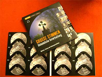 GROSSE STIMMEN Unheimliche Unterhaltung. Insgesamt 12 CDs (9 Lesungen und 3 Hörspiele) für nur 12,99 Euro, in einer sehr repräsentativen Verpackung, die an eine LP erinnert. Die Fantasy-, Mystery- und Schauergeschichten werden u.a. von Peer Augustinski, Armin Rohde und Katja Riemann gelesen. Und auch die Autoren können sich hören lassen. Edgar Allan Poe, Wolfgang Hohlbein oder Nikolaj W. Gogol. Ebenfalls dabei: eine Geschichte von Titus Müller. Glückwunsch, Titus!