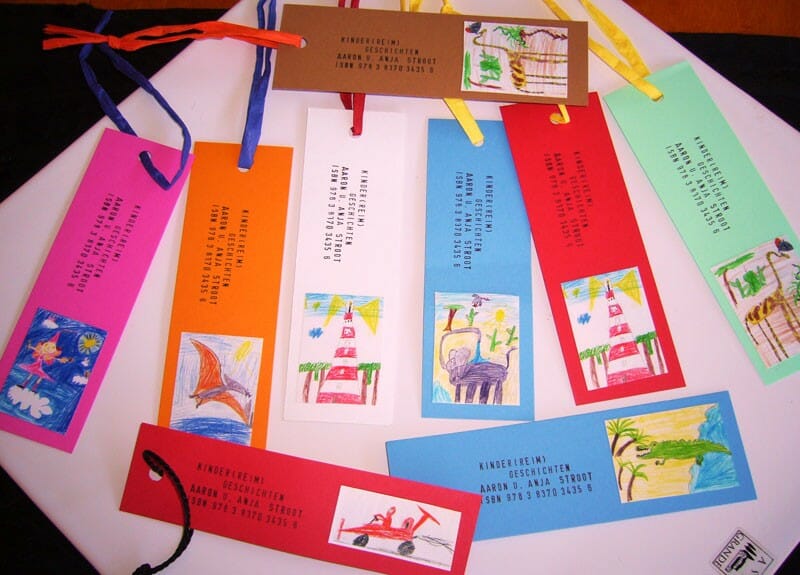 Da ich mir wünschte, dass die Kinder von meiner Lesung etwas mit nach Hause nehmen können, bastelte ich Lesezeichen und bereitete vorgeschnittene Bastelsätze für die Grundschulen vor. Auf diese Weise erhält jedes Kind zum einen die Informationen zum Buch, zum anderen aber auch ein Lesezeichen mit besonderem Wert. Jedes Kind wählt selbst die Farbkarte, das Lieblingsmotiv des Buches sowie ein farbiges Band für sein persönliches Lesezeichen aus. Da es vorgeschnitten ist, ist es auch wirklich für jedes Kind möglich, ein schönes Lesezeichen selbst zu gestalten und zu basteln. Es wird vom Kind selbst zusammengestellt, hat natürlich dadurch einen besonderen Wert und will auch benutzt werden. Die Leselust wird auf diese Weise angeregt und gefördert.