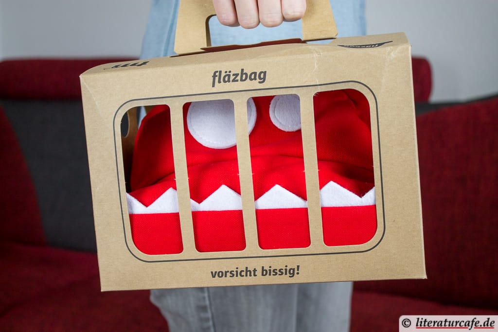 Bereits der Name Fläzbag signalisiert, dass man das Kissen mit einem Augenzwinkern vermarktet. Der »Kissenvorsprung«, auf dem man E-Reader oder Tablets ablegen kann, ist wie ein Überbiss gestaltet, und eine Zahnreihe aus Filz verhindert, dass der Reader nach vorn wegrutscht. Zwei verschieden große weiße Punkte blicken den Leser monsterartig an, bevor man sie mit dem Lesegerät verdeckt. Geliefert wird das Kissen daher in einem Pappkarton, der wie ein Käfig gestaltet ist. »vorsicht bissig!« ist darauf zu lesen. Das macht sich ohne Frage auch als Geschenk ganz gut und erregt Aufmerksamkeit.