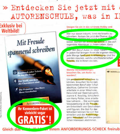 Folge 4: Schickt die Lektoren in die Schule! Wohl niemand schreibt fehlerfrei, und nicht erst seit der Rechtschreibreform ist die Verwirrung um die korrekte Schreibung groß. Dennoch gibt es immer wieder wunderschöne Rechtschreibfehler in der Öffentlichkeit zu sehen. Unsere Serie »Helden der Rechschreibung« stellt diese in loser Reihenfolge vor. Wenn auch Sie einen Helden fotografisch dokumentiert haben, dann schicken Sie uns doch das gescannte Bild, und wir ehren demnächst hier Ihren Helden. Aus der neuesten Ausgabe der Autorenzeitschrift »Federwelt« fällt uns ein Prospekt entgegen. Es ist eines jener überaus bunten und mit Text zugepflasterten Faltblätter, die man oft auch in Frauenzeitschriften findet. Prospekte, die für Kosmetikartikel oder Gesundheitsschuhe werben. Aber dieses Papier stammt nicht von irgendwem, sondern von keinem geringeren als von der Verlagsgruppe Weltbild aus Augsburg. Und geworben wird für DIE GROSSE WELTBILD AUTORENSCHULE. »Erfahrene Lektoren korrigieren Ihre Ergebnisse sorgfältig« ist dort zu lesen. Und wir denken uns bei einem Blick auf die Innenseite, dass der Laden dort ganz schön brummen muss, denn leider haben die erfahrenen Lektoren wohl keine Zeit gehabt, den eigenen Werbeprospekt mal Korrektur zu lesen. »Ihr Kennenlern-Paket ist vieleicht sogar GRATIS*!« lesen wir dort in einer dicken roten Box und werden auf das Kleingedruckte verwiesen. Wir lesen weiter: »Wer nur davon träumt, lernt nie kreativ zu schreiben.«; und wir fragen uns: Meinen die jetzt »wer nur davon träumt, lernt nie, kreativ zu schreiben« oder »wer nur davon träumt, lernt, nie kreativ zu schreiben«? Weiter unten verspricht man: »Und Sie werden staunen, welche schriftstellerischen Talente, die in Ihnen stecken.« Danke, wir brauchen nicht Autorenschule, weil auch schon reichlich so wir staunen. 27.10.2003 |