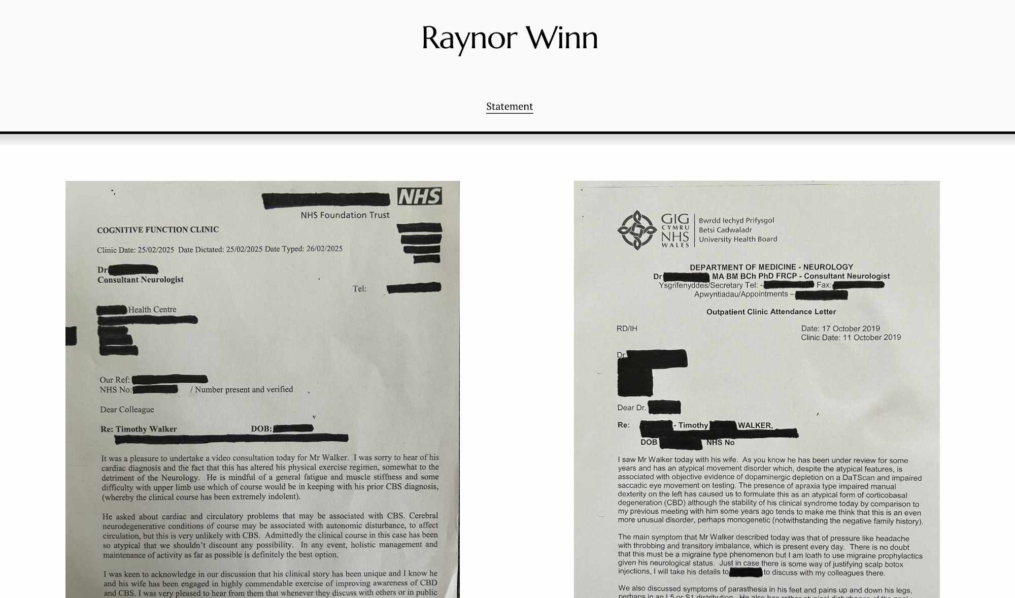 Den schwersten Vorwurf – dass ihr Mann die Krankheit erfunden habe – nennt Raynor Winn im Statement auf ihrer Website »völlig abscheulich, unfair und falsch«. Mit Erlaubnis ihres Mannes veröffentlicht sie sogar zum Teil geschwärzte Auszüge aus Arztbriefen, die zeigen sollen, dass er seit Jahren wegen CBD/CBS (Corticobasal Syndrome) behandelt werde. Die Dokumente stammen aus den Jahren 2015 bis 2025 und enthalten Diagnosen verschiedener NHS-Neurologen.
