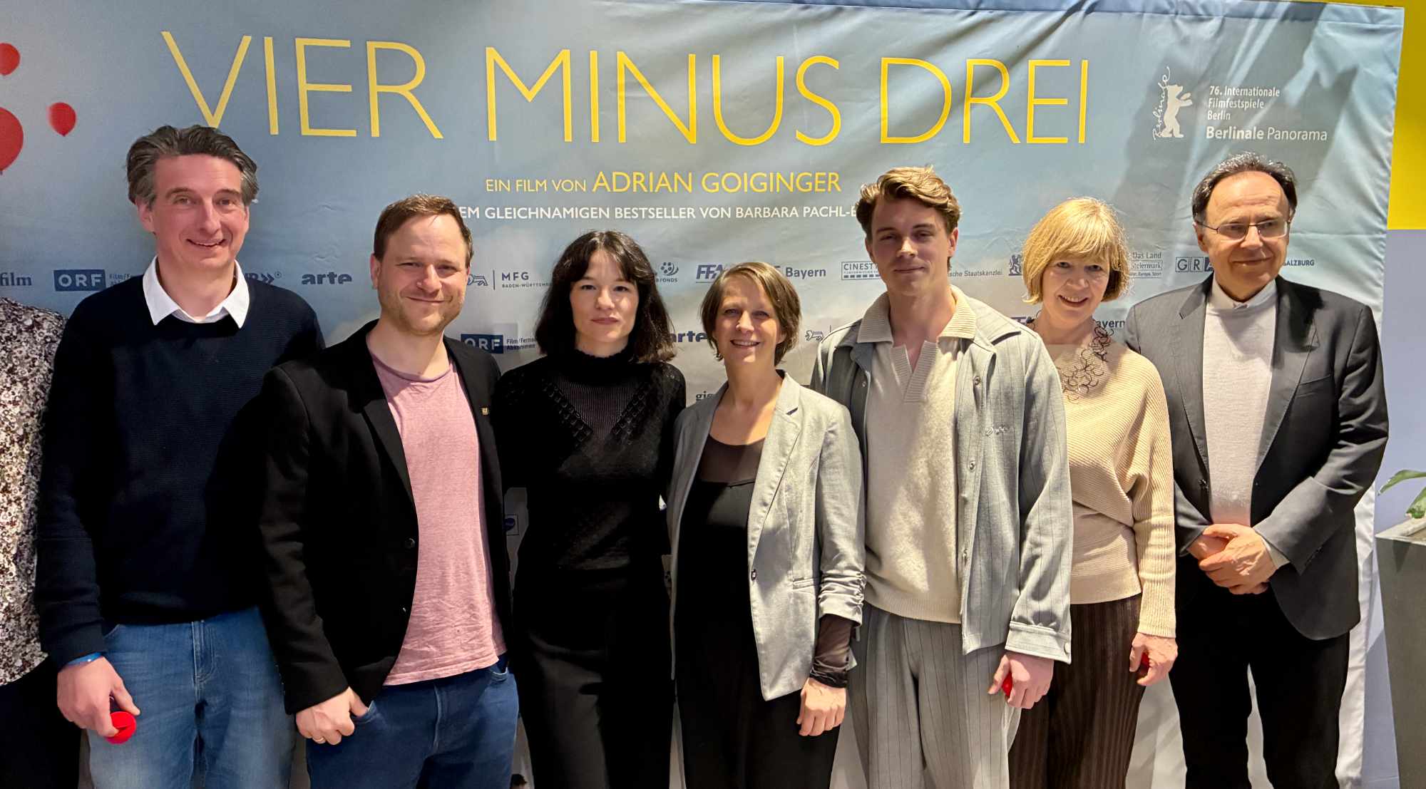 »Vier minus drei«, Filmpremiere am 14. April 2026 in Stuttgart. Von links nach rechts: Tobias Lehmann (Alamode Film), Regisseur Adrian Goiginger, Hauptdarstellerin Valerie Pachner, Autorin Barbara Pachl-Eberhart, Gerrit Klein (Giganten Film), Brigitte Dithard (SWR), Carl Bergengruen (MFG)