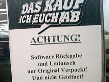 Ein fotokopierter DIN-A4-Zettel im Kassenbereich eines bekannten Elektronikmarktes. Vielleicht der Grund, warum man den alten Werbeslogan doch nicht mehr für passend hielt. Gesehen am 28. August 2008. Gegenvorschlag: »Rückgabe oder Umtausch von Software nur in ungeöffneter...