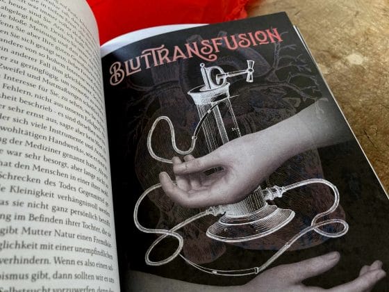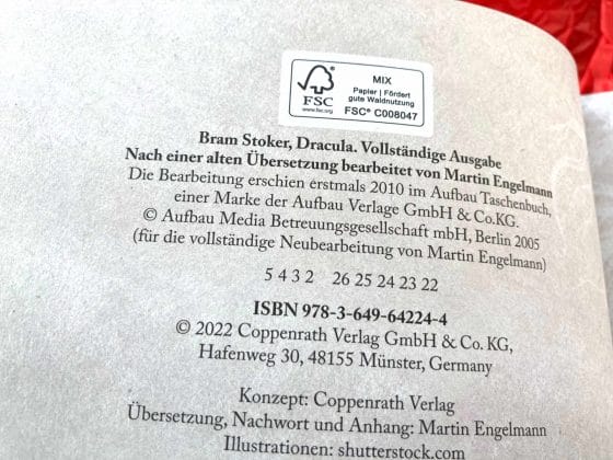 Der Coppenrath Verlag hat dem Lesevergnügen noch eines draufgesetzt und Dracula in der engelmannschen Version als illustrierte Schmuckausgabe veröffentlicht. Mit silbernem Buchschnitt, rotem Vorsatz und beigelegten Elementen: da gibt es die historische Karte Transsilvaniens, alte Bahnfahrpläne, eine Info-Broschüre über die Bluttransfusion und zahlreiche Briefe und Postkarten. Das alles ist liebevoll mit vielen Details gestaltet. Beste Ausstattung zur besten Textfassung.